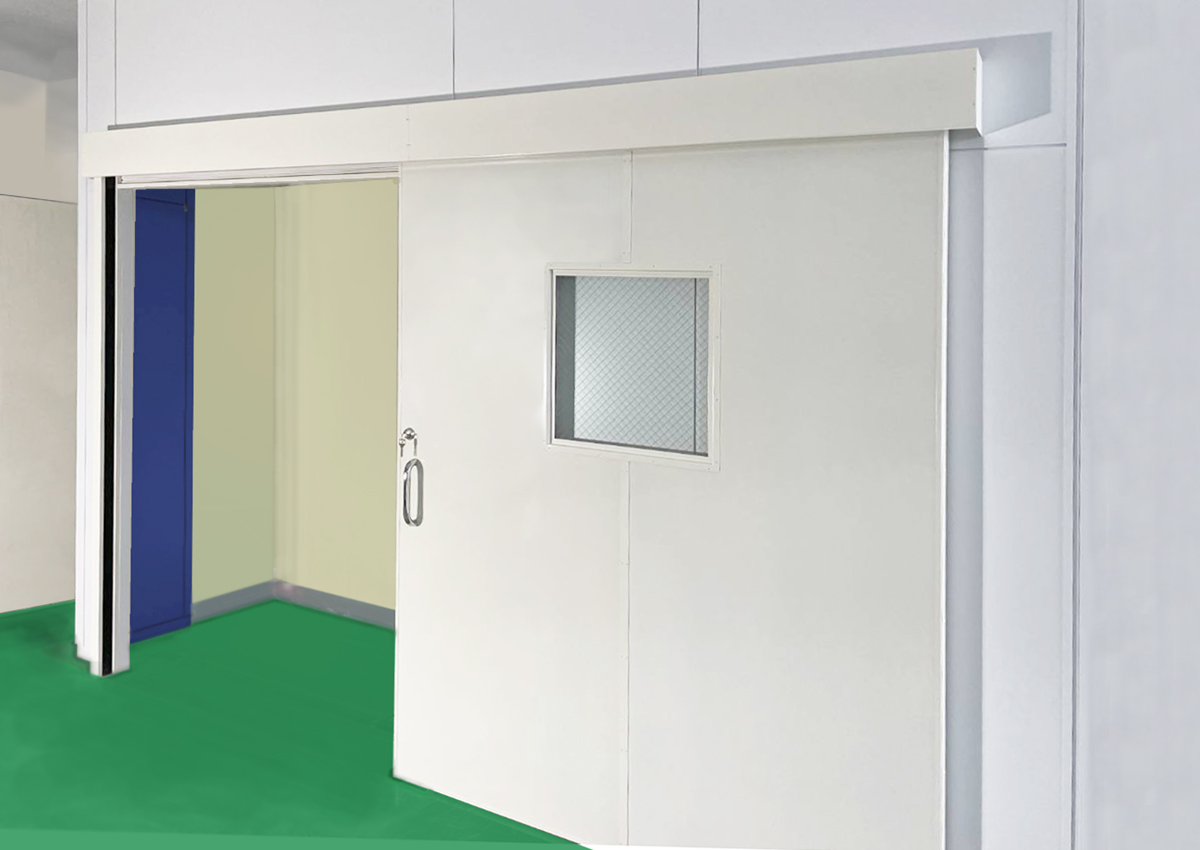 防火区画内の開口で実績がある防火設備仕様の自閉式ハンガードアをご提案、不燃スチールパーティションと組み合わせて納品いたしました。開口部分は出入り用の台車に合わせて有効開口 W=1,600 を確保しています。