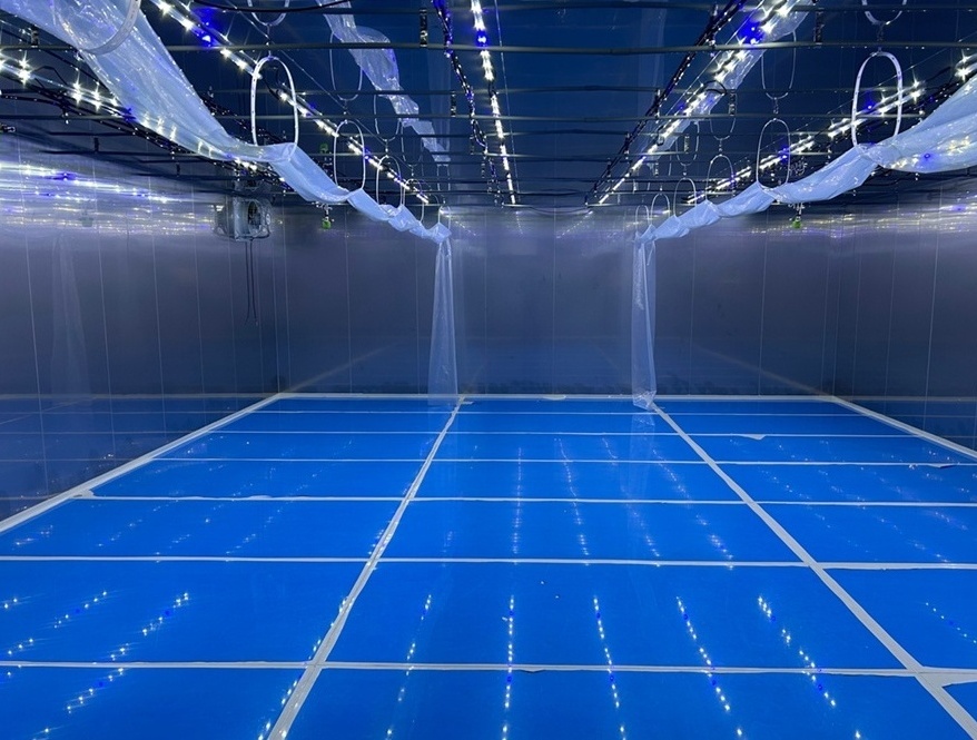 床材は硬質塩化ビニール樹脂押出板を使用した防水床となります。栽培用ブースのサイズは11M×7.4M(天井高2.5M)最大5600個の菌床を収納できるスペースをご提供致しました。