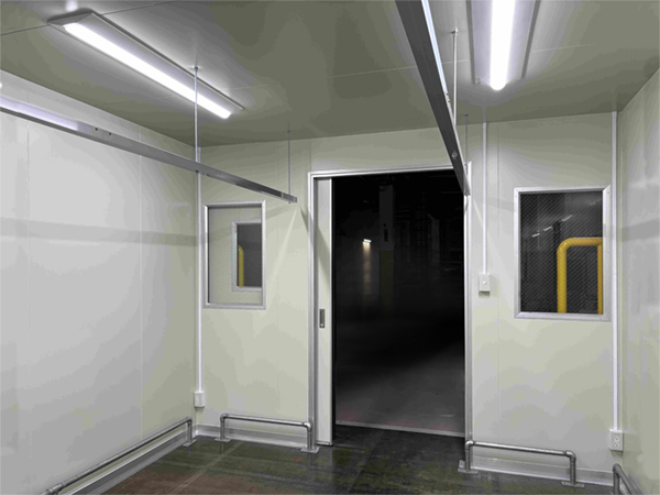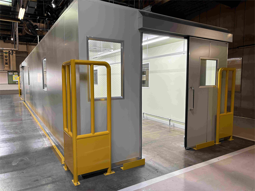 恒温ブースのサイズは貯蔵時の台車付きコンテナ数に合わせる形で3.3M×15M(天井高2.4M)とし、気密性の高い断熱パネル(天井・壁)でご提案いたしました。今回のブース設置では恒温管理のための空調工事や部屋内外の台車ガード設置工事も併せてグロスでご注文頂き、工場様の貯蔵環境管理のお役に立つことができました。