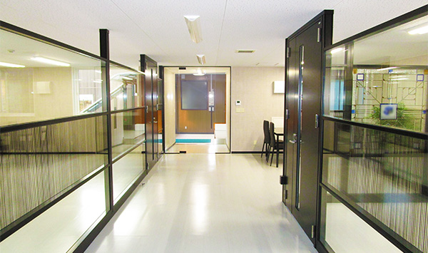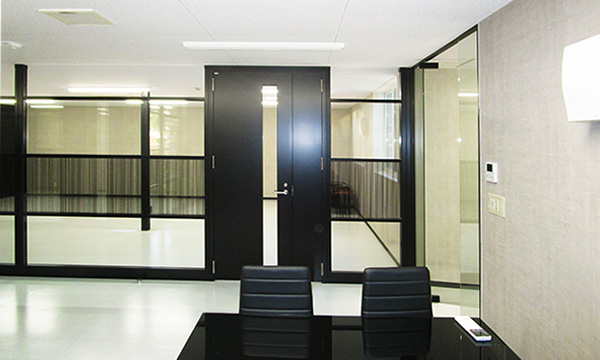 パーティションの縦目地間隔はMAX2.400mmまで可能ですので、ガラスパネルによる圧迫感を感じさせない空間を作り出すことができます。