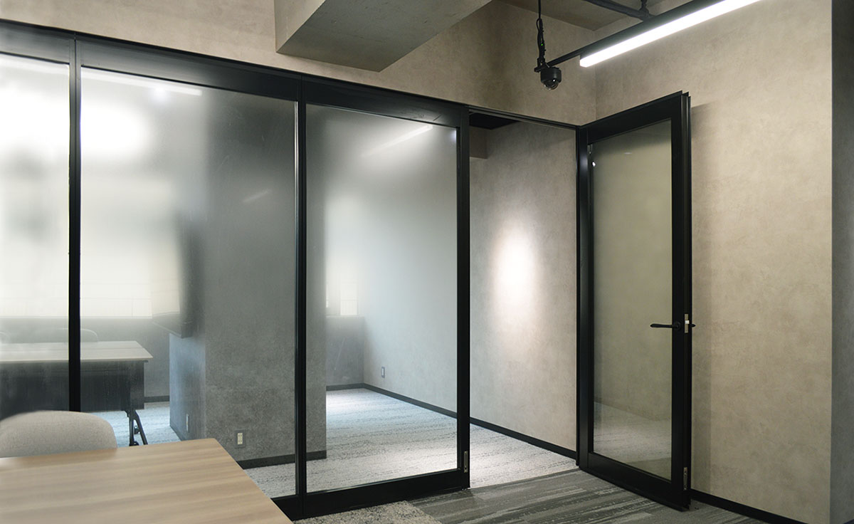フロア全体を解放感のある空間にしたいとのご要望をいただき、用途に応じて打ち合わせができるように移動式間仕切を設置いたしました。打合せスペースにはガラス(強化ガラス 5 ㎜+飛散防止フィルム貼)を使用し、パネルで密閉しないオープンなスペースにすることで開放的な空間を演出、インパクトのあるブラックフレームが交わることで高級感のある部屋に仕上がりました。