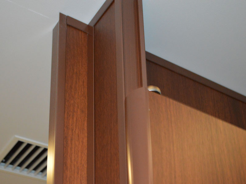 パネル表面材は木目柄メラミン化粧板を使用し、アルミエッジは木目柄に近い色で焼付塗装をしていますので、パネルとエッジの一体感あふれる高級感のあるトイレ空間に仕上がっています。