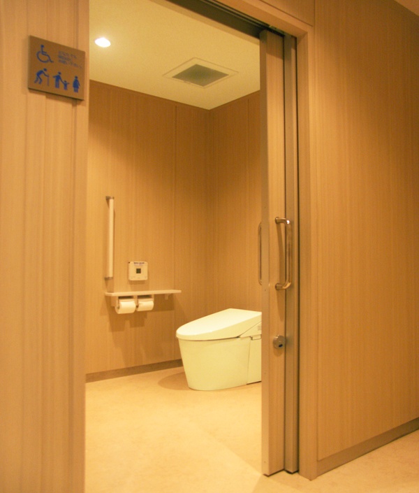 小さなお子様を連れた方や、車椅子の方もご利用される多目的トイレの入口ハンガードアには外付けの2連引戸を設置し、より広く開口幅をとれる設計になりました。