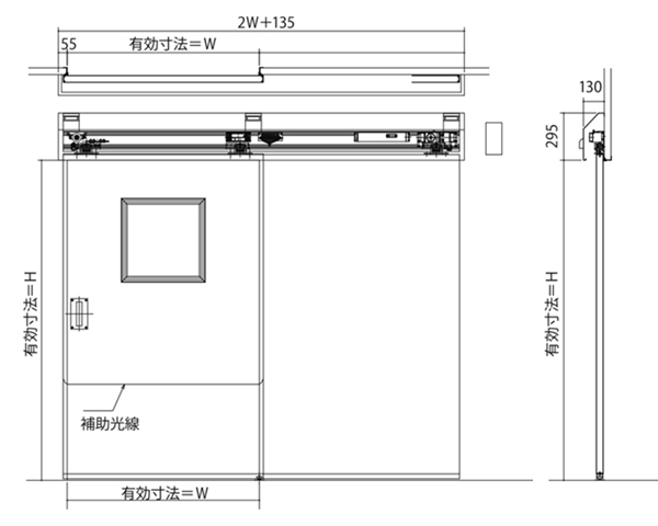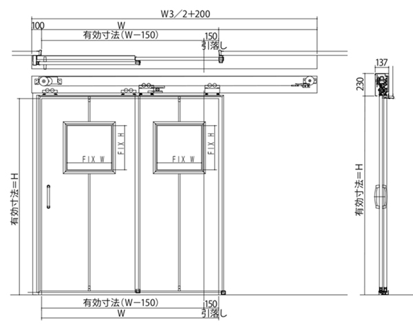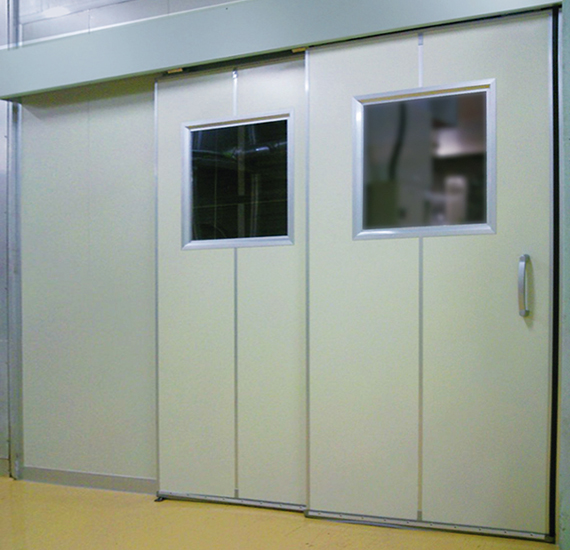 工場内部など限られた狭いスペースにおすすめな引き戸です。このドアは、扉1枚分に2枚分を収納でき、大開口を有効に使えて便利です。手動・自閉・自動からお選びいただけます。
