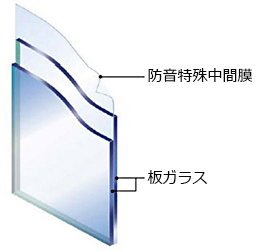 防音性能の特殊中間膜2枚をガラスで挟んだ合わせガラスです。
