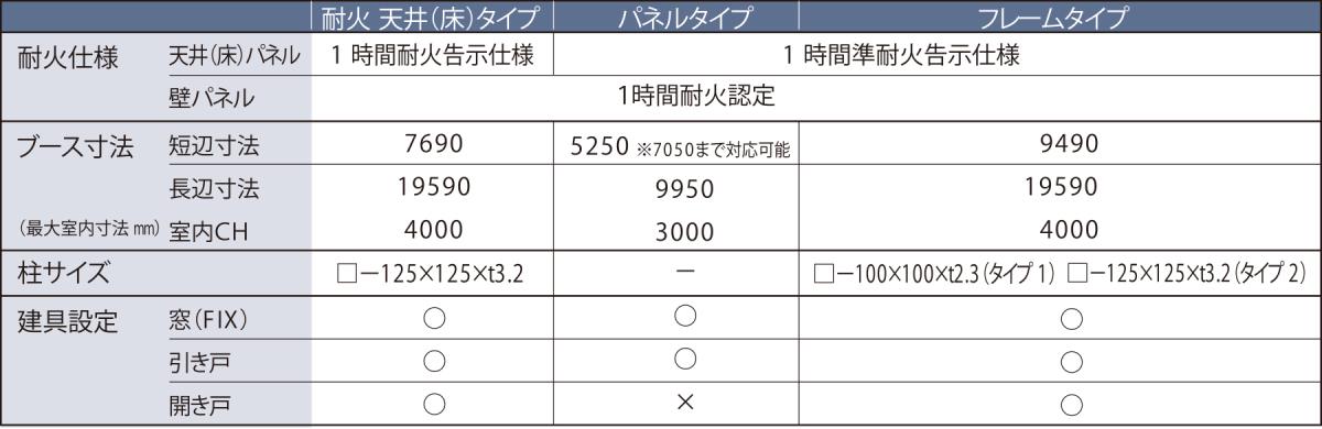 壁は個別認定の耐火構造の壁パネルを組合わせたブースで、1 時間耐火・1 時間準耐火に対応する仕様を設定しています。