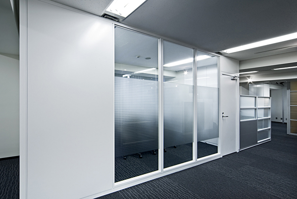 電源スイッチのON、OFFで瞬時に透明・不透明を切替えることができるガラスパーティションです。視線をコントロールできるので、「見せる時と見せない時」の状況に合わせた空間を作り出すことができます。