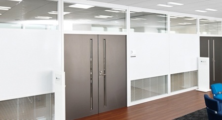 FHSシリーズにガラスパーティションを連結することで、透明感のある空間を作り出すことができ、デザイン重視のレイアウトには欠かせないアイテムです。