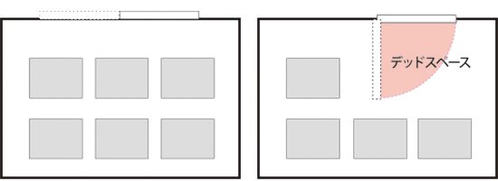 開き戸のように開けた時のデッドスペースがなく、室内を有効に活用できます。また、間仕切が戸袋の役目をする全くデッドスペースのない戸袋タイプもあります。