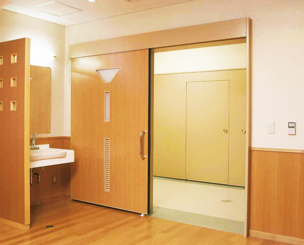既設の壁開口部に取付が出来る仕様となっていますので、リニューアル工事に適しています。また軽鉄ボード壁の外付けハンガードアとしても最適で、ドアと含めて先付け三方枠も壁厚に合わせてご用意しております。