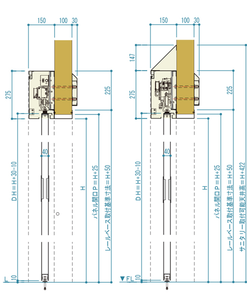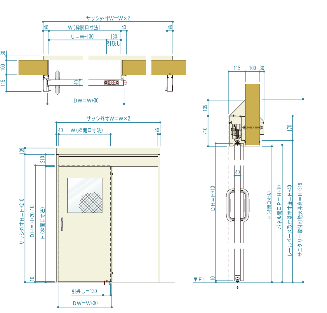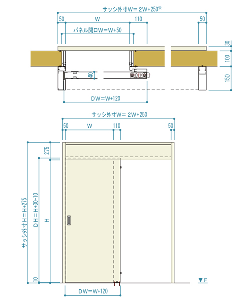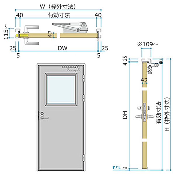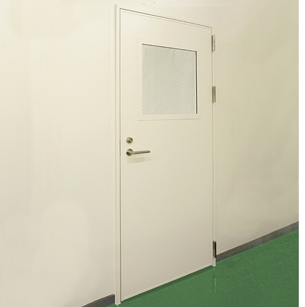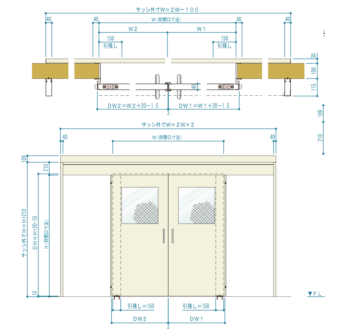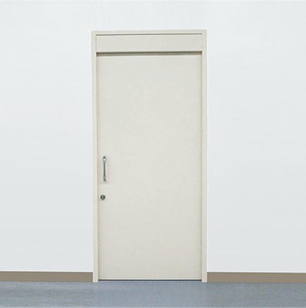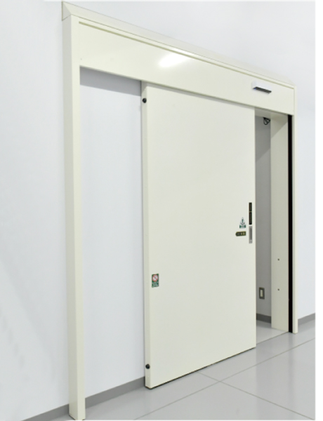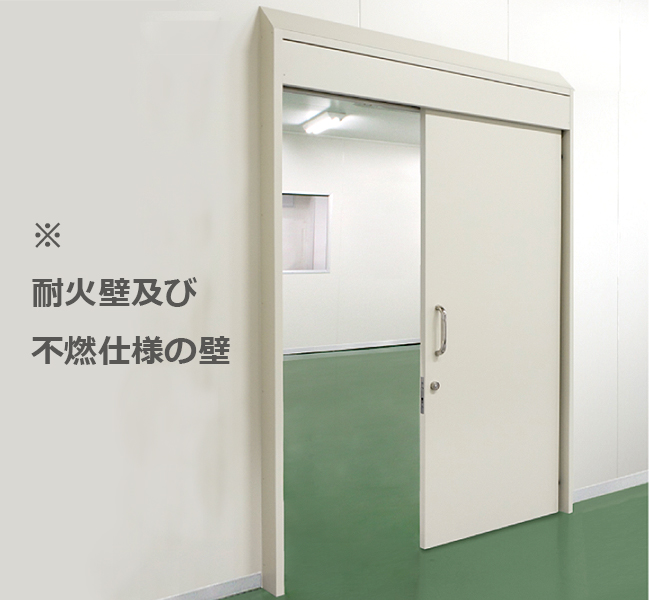耐火壁にレール直付け式のスチール製スライドドアです。防火設備(6.8mm網入りガラス窓付・窓無し)もしくは特定防火設備(窓無し)として使用できます。(ただし事前に行政機関への適合性のご確認を推奨します)片引き・両引きにも対応可能です。