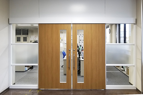 ■事務所エントランスに木目調のハンガードア(スチールパーティション+引分ハンガードア)