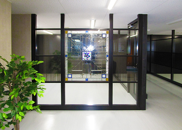 お客様が行き来するエリアに企業のブランドマークをガラスパーティション(ペアガラス仕様)内に組み合わせることで、透明感のある企業イメージを作り上げてみませんか?