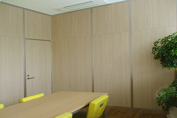 アルミパーティションのパネル色といえばホワイトやアイボリーが標準色ですが、最近はインパクトのあるカラーパネルで空間を仕切るパターンも増えています。部屋の用途に合わせてパネル表面に木目柄をお使いになることで、温かみのある空間を演出できます。