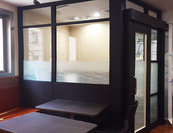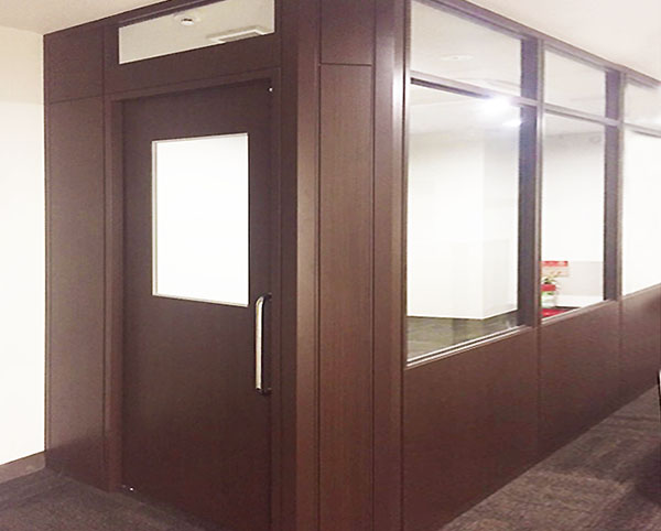 室内に違和感が出ないようパーティションの表面は周囲の什器に近い柄や色で合わせました。出入口はたばこの煙が漏れにくいよう、開きドアではなく自閉式のハンガードアとしています。